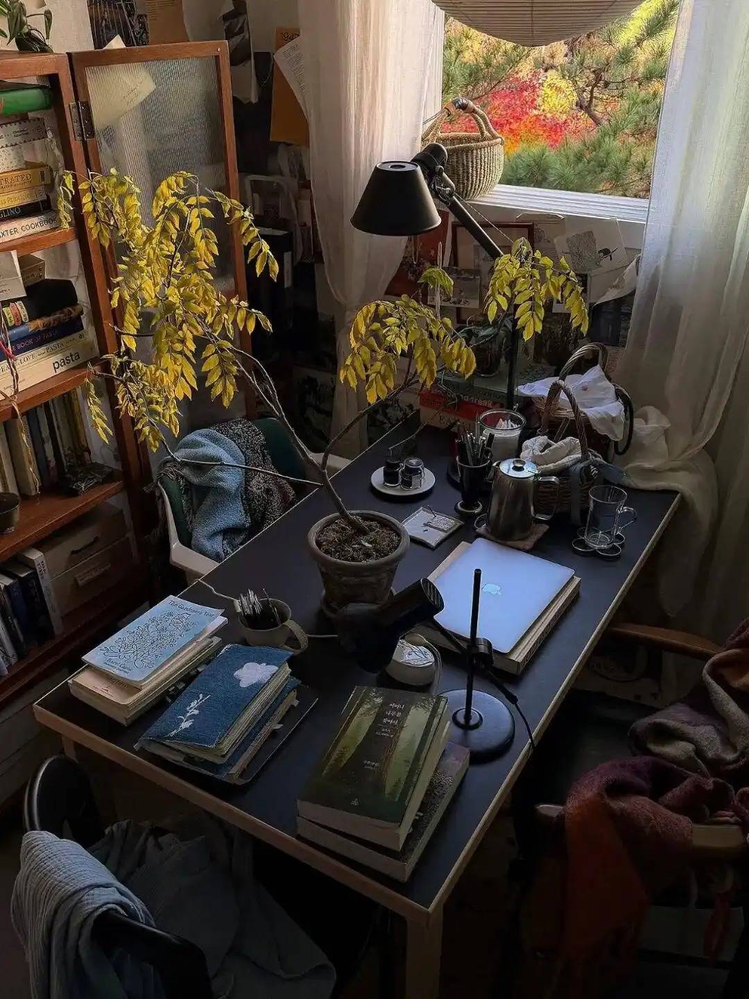 第二款是秋日治愈款,完全是我的梦中情桌!深色桌面+暖黄灯光,书、绿植、小摆件堆满桌子,窗外是秋天的红叶,窝在这里看书、喝咖啡,感觉连时间都慢下来了,温馨感直接焊死!