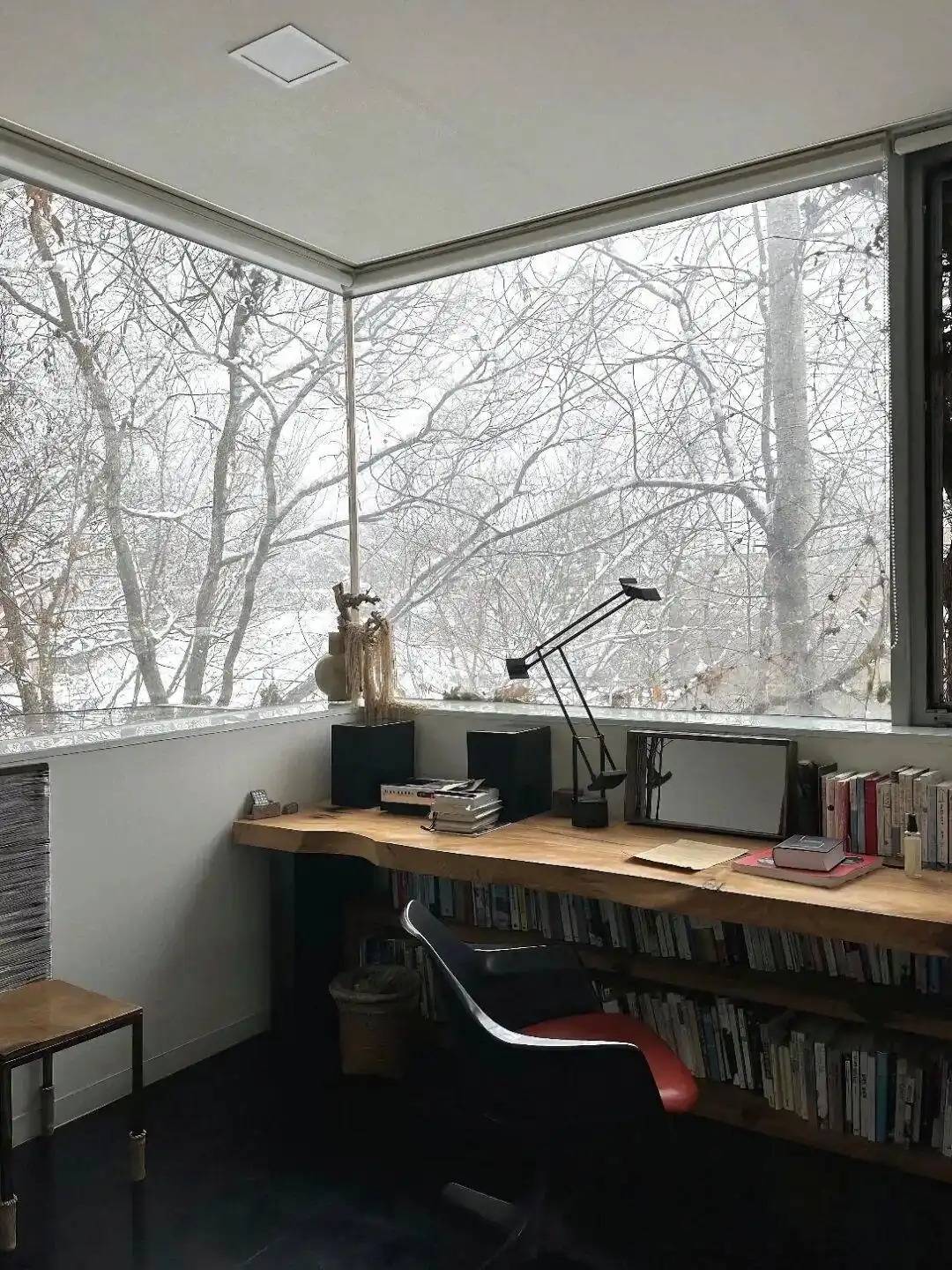 第一款是冬日雪景款!谁能拒绝被雪景包围的工作台啊!整面落地窗框住银装素裹的树林,原木长桌+满墙书籍,黑白配色干净又高级,在这里办公学习,感觉效率都翻倍了!连窗外的雪都成了背景板,氛围感直接拉满!