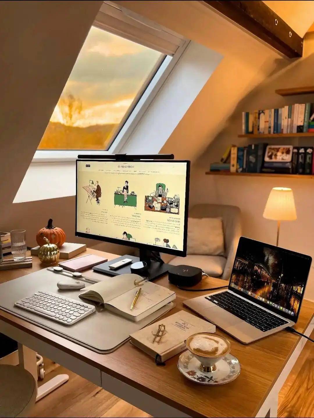 第三款是阁楼夕阳款,谁看了不心动!斜顶天窗透进温柔的夕阳,原木书桌+双屏电脑,小南瓜、咖啡杯这些小细节超戳人,在这里办公追剧,连打工人的疲惫都被治愈了!
