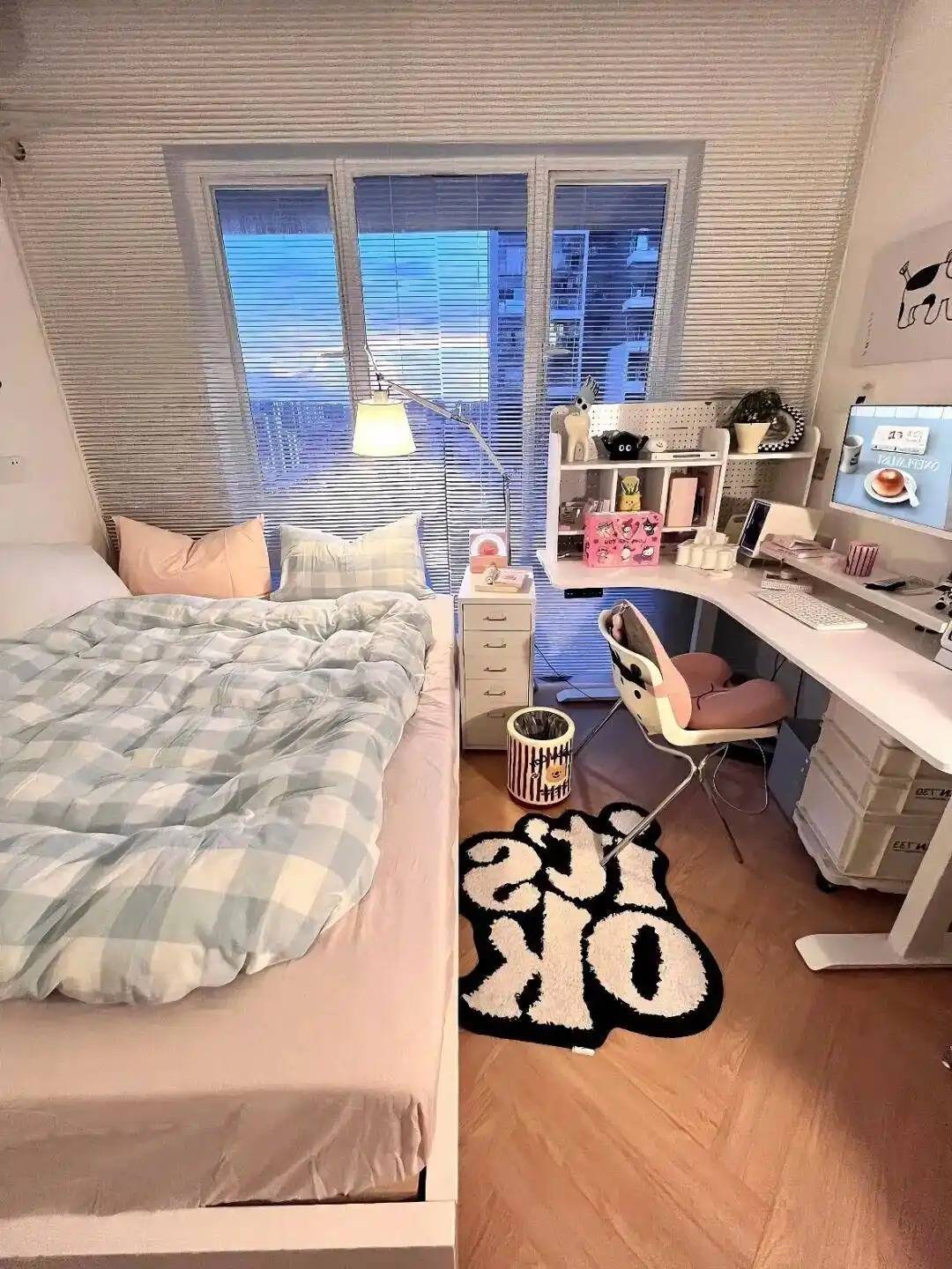 第四款是韩系ins款,学生党直接抄作业!床和书桌连在一起,蓝白格子床品超清爽,转角书桌+洞洞板收纳,阳光透过百叶窗洒进来,软乎乎的氛围,学习都变得不痛苦了!