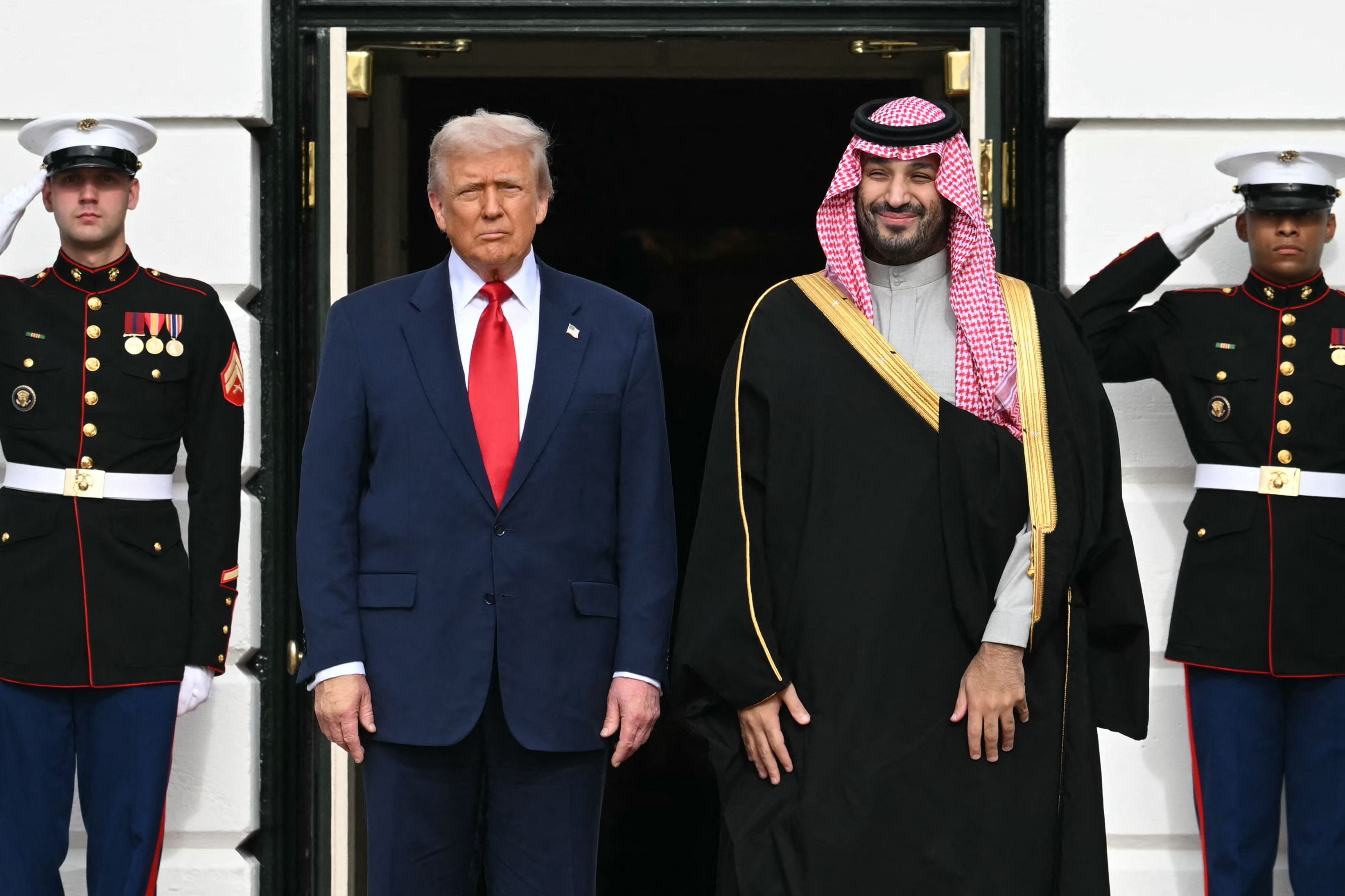 11月18日,美国总统特朗普(前左)在华盛顿白宫欢迎到访的沙特阿拉伯王储兼首相穆罕默德(前右)。新华社/法新